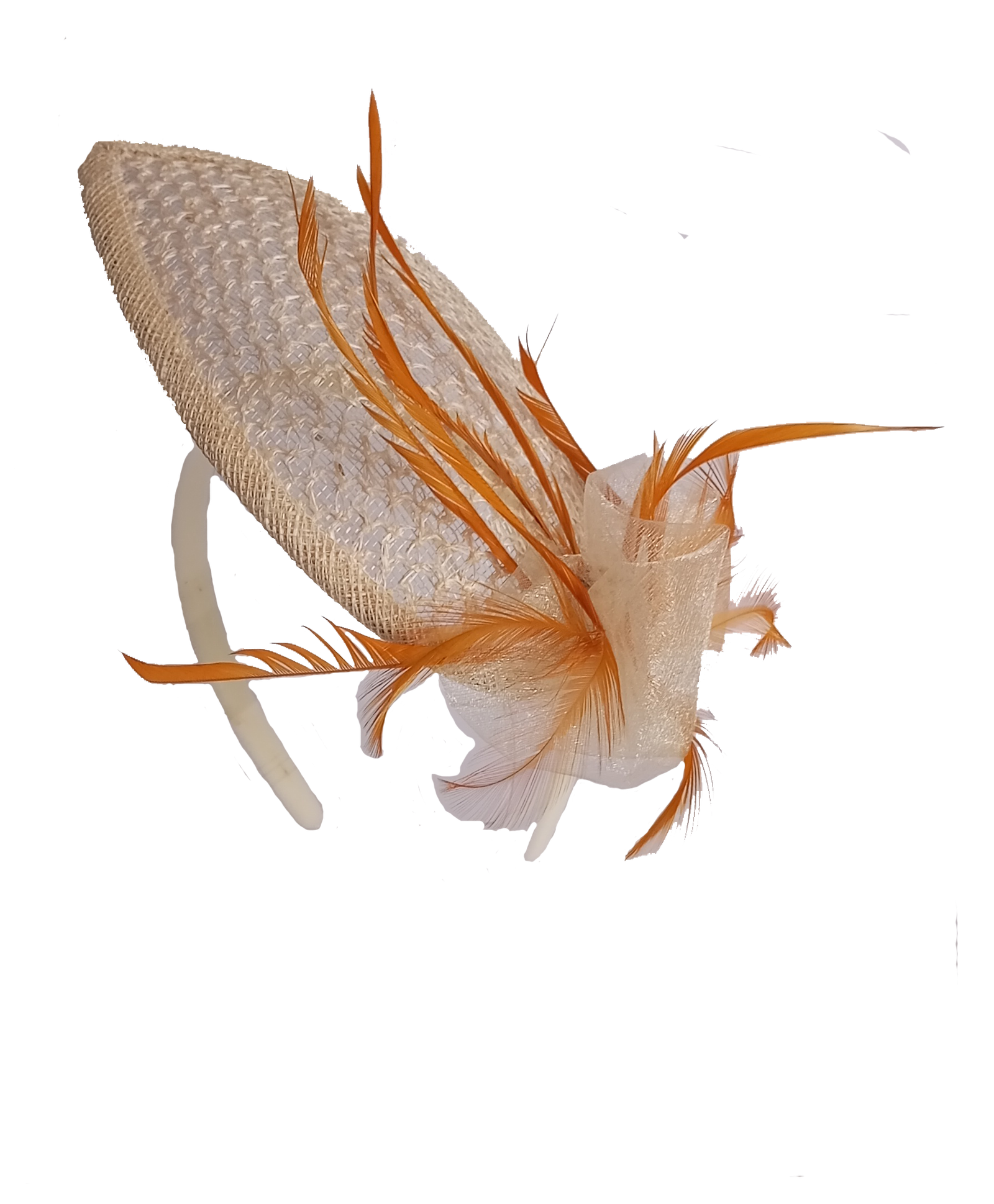 La hoja beige con pluma amarilla es un tocado luminoso y original, ideal para bodas de día y eventos al aire libre.
