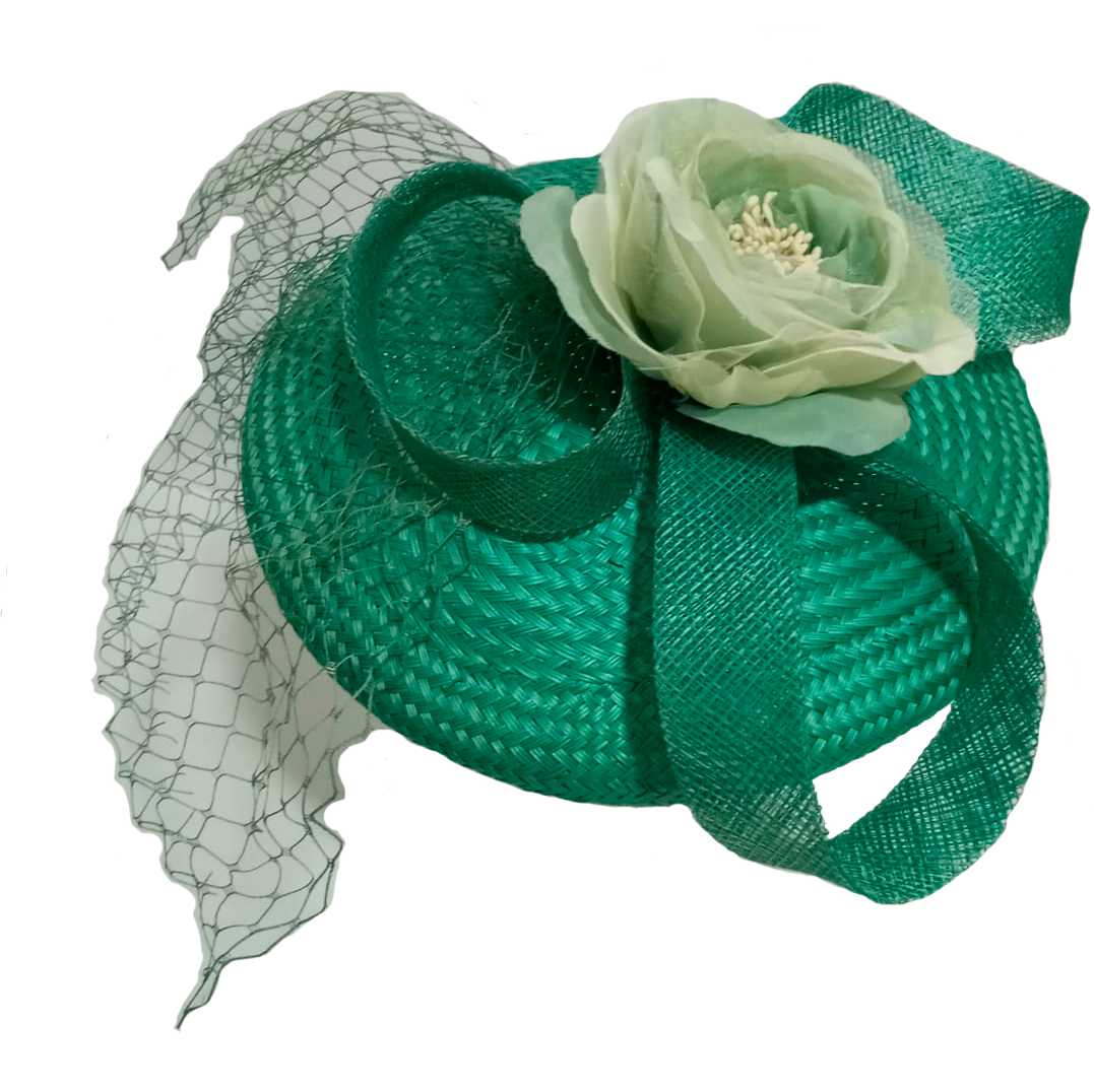 Este tocado destaca por su tonalidad verde agua, una elección de color que combina frescura con elegancia. Su forma grande, cuidadosamente elaborada, asegura que se convierta en el centro de atención, mientras que los detalles precisos reflejan la calidad superior de su fabricación. Cada elemento de este accesorio ha sido diseñado para ofrecer una experiencia visual que exuda exclusividad y buen gusto.
