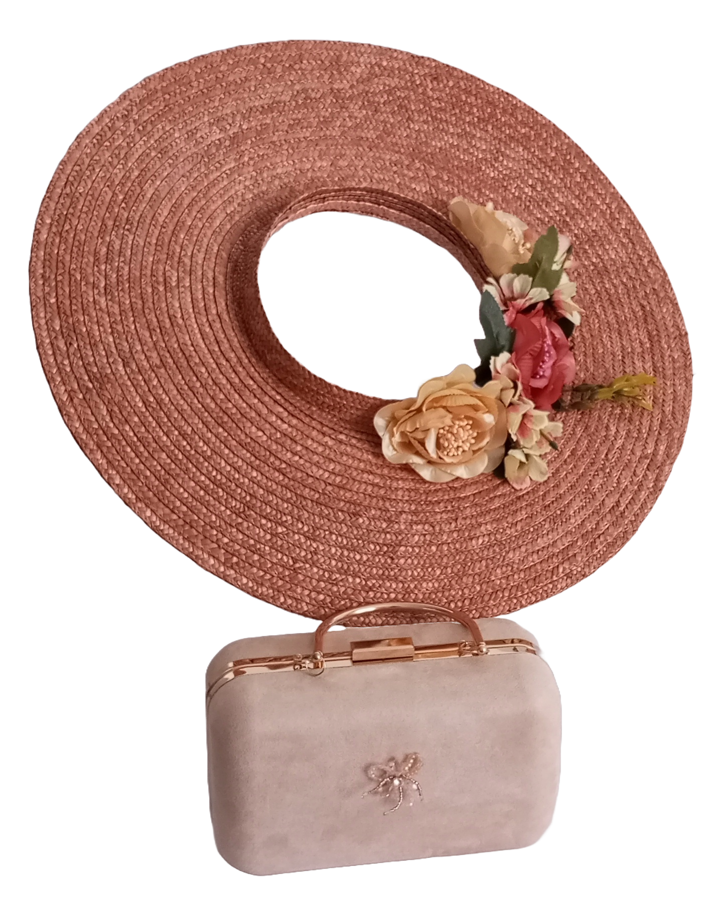La ala pamela en un elegante tono rosa palo oscuro destaca por su confección meticulosa y materiales de alta calidad. Su diseño amplio y sofisticado no solo protege del sol, sino que también realza cualquier conjunto con un toque único y lujoso. El bolso de ante incluido armoniza perfectamente, proporcionando un acabado coordinado que equilibra sofisticación clásica y practicidad moderna. Juntos, estos dos elementos forman una dupla perfecta para ocasiones especiales o para quienes buscan destacar con su estilo.