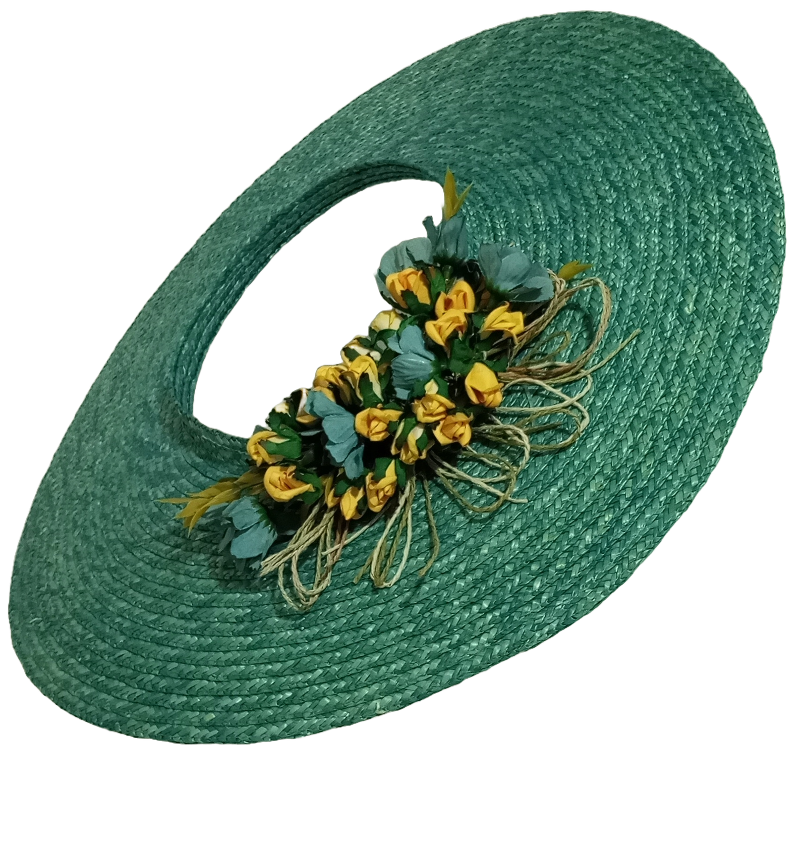 El ala amplia de 45 cm otorga una presencia destacada y enmarca el rostro con armonía, realzando la silueta con gracia y personalidad. Esta amplitud convierte a la pamela en un complemento versátil, capaz de transformar cualquier conjunto en un look memorable y lleno de distinción. El contraste entre el turquesa intenso y los capullos amarillos delicados aporta un aire refinado que se adapta tanto a estilismos clásicos como a propuestas más contemporáneas, ofreciendo múltiples posibilidades de combinación.
