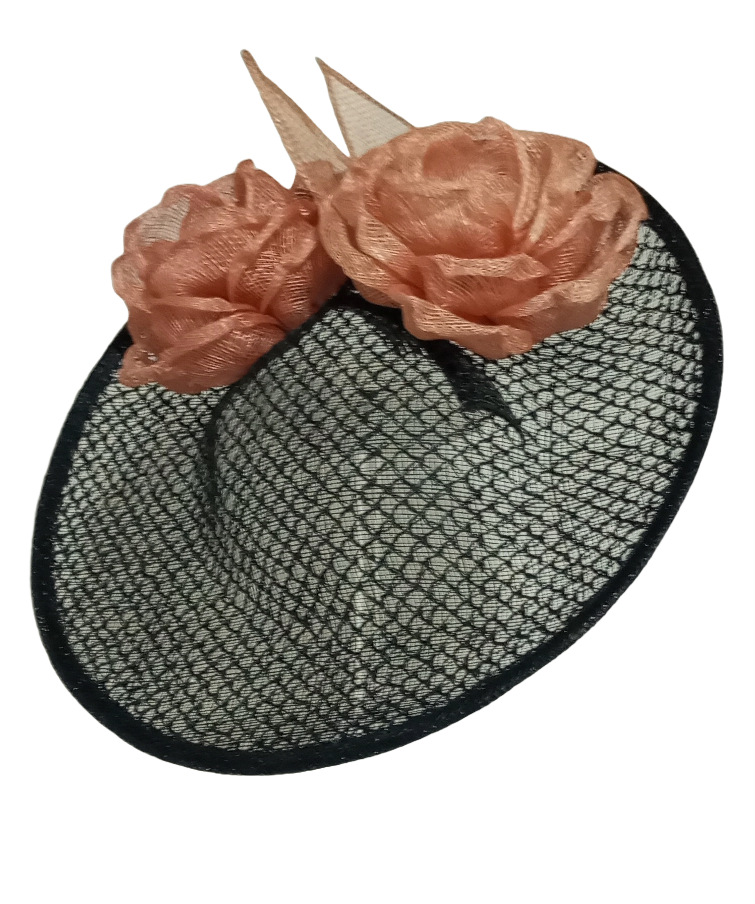 Este sombrero está elaborado en un material de rejilla de alta calidad con un acabado en negro profundo, proporcionando durabilidad y ligereza. Las flores salmón adornan delicadamente el diseño, creando un contraste visual encantador que realza cualquier look. Su tamaño pequeño es perfecto para quienes buscan un accesorio elegante sin ser demasiado elaborado.