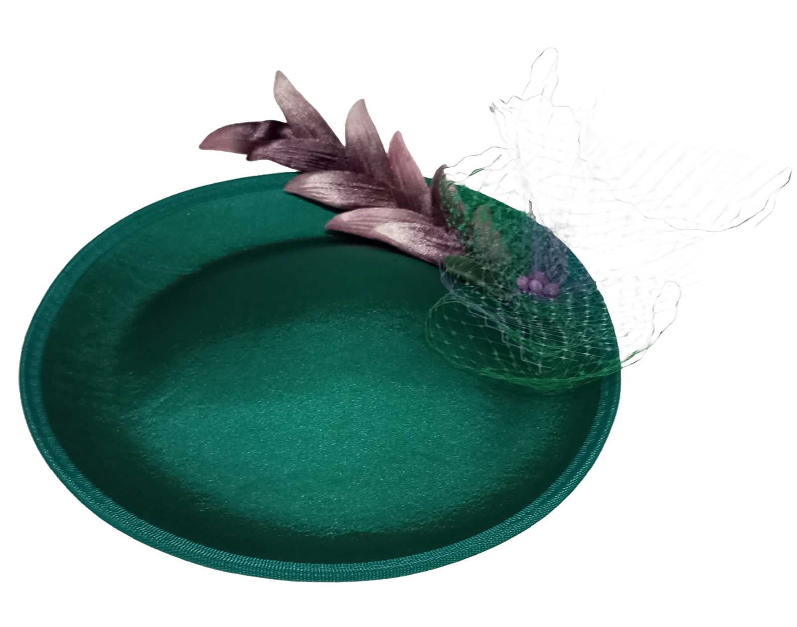 Fabricado con raso de primera calidad, este sombrero ofrece un acabado lujoso que no pasa desapercibido. Su tonalidad verde oscura transmite sobriedad, mientras que los detalles en morado y plumeti destacan por su creatividad y singularidad. El diseño estructurado asegura un ajuste cómodo y una forma que se mantiene impecable a lo largo del tiempo. Ideal para ocasiones especiales, pero lo suficientemente versátil para combinarlo con diferentes estilos.